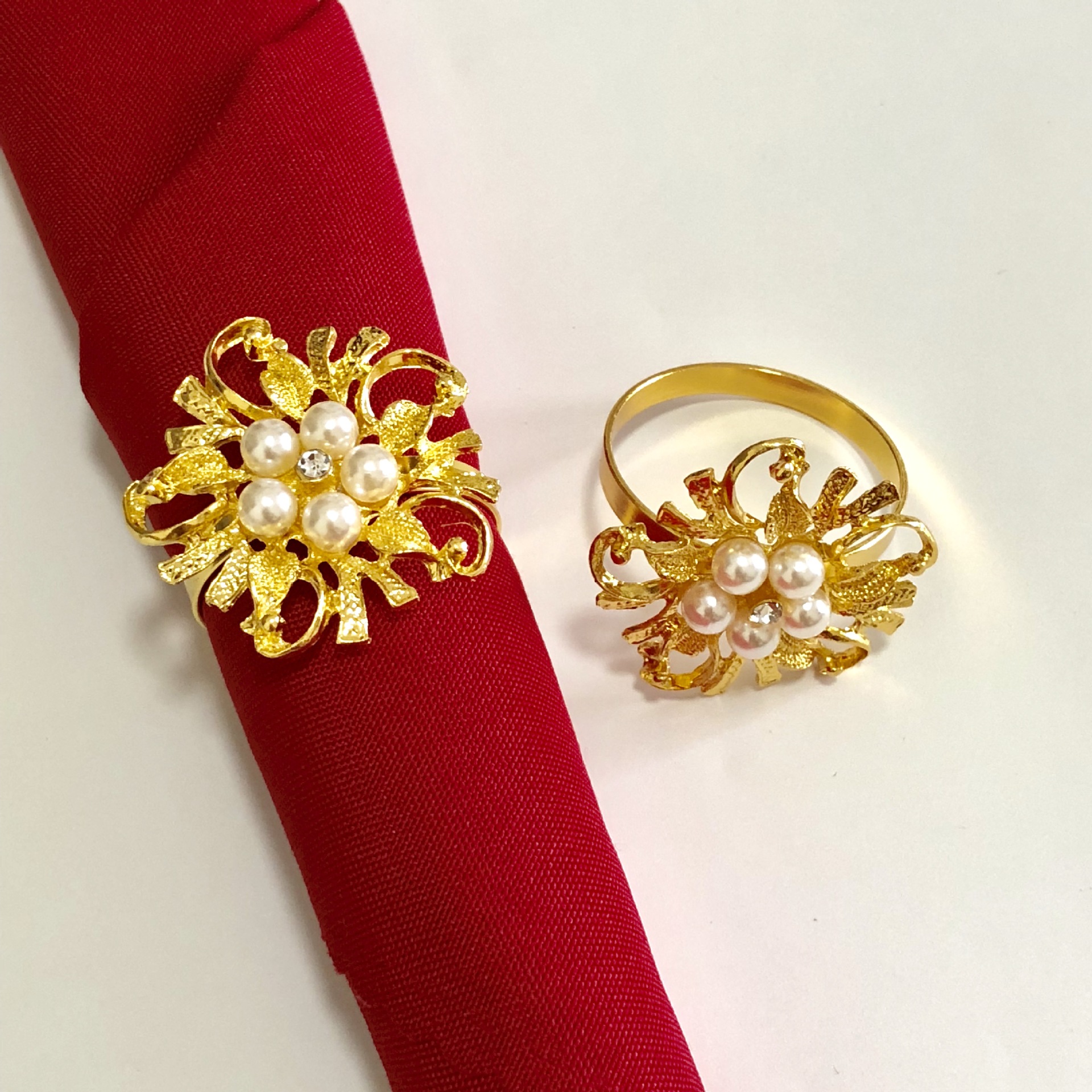 ホテルのファッショナブルでシンプルなダイヤモンドがちりばめられたパールゴールドフラワーナプキンリングホテルレストランナプキンバックル工場直販