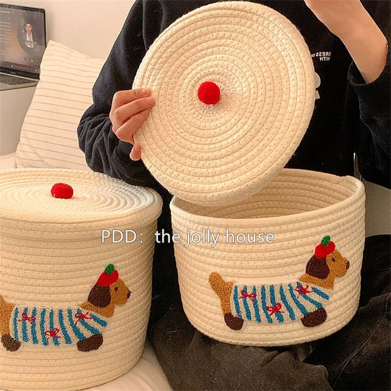 漫画かわいい子犬雑貨織物収納バスケット大容量防塵収納バケツ蓋付き家庭用デスクトップ収納バスケット