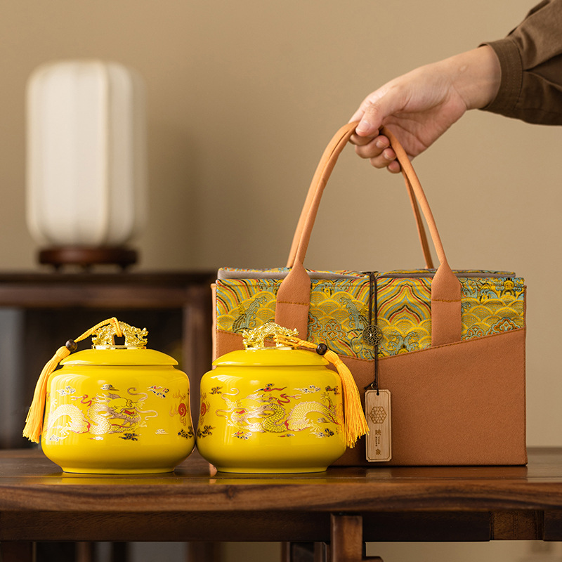双龍戯珠陶磁器茶葉缶レトロ布袋包装空箱紅茶緑茶龍井碧螺春散茶礼箱
