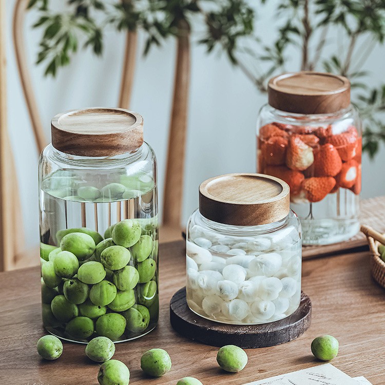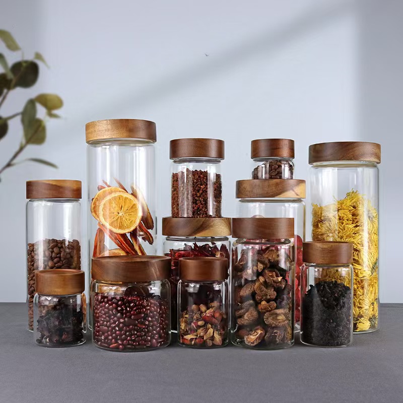 アカシア材ガラス保存容器 キッチン穀物茶葉容器 コーヒー豆容器 ナッツ・ドライフルーツ防湿保存容器