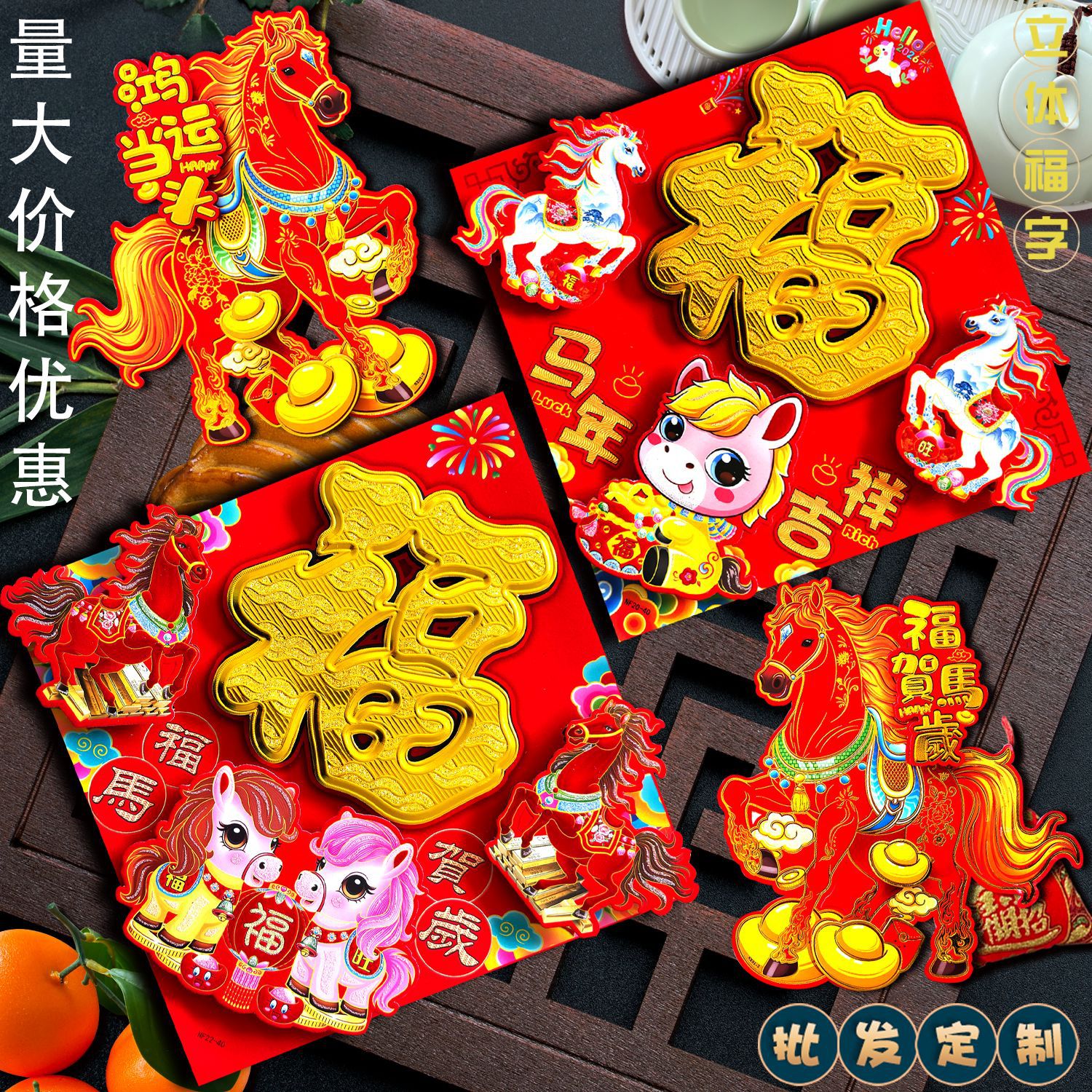 新年装飾用の馬年福字金箔植毛立体ドアステッカー、春節飾り、干支のお祝い、卸売