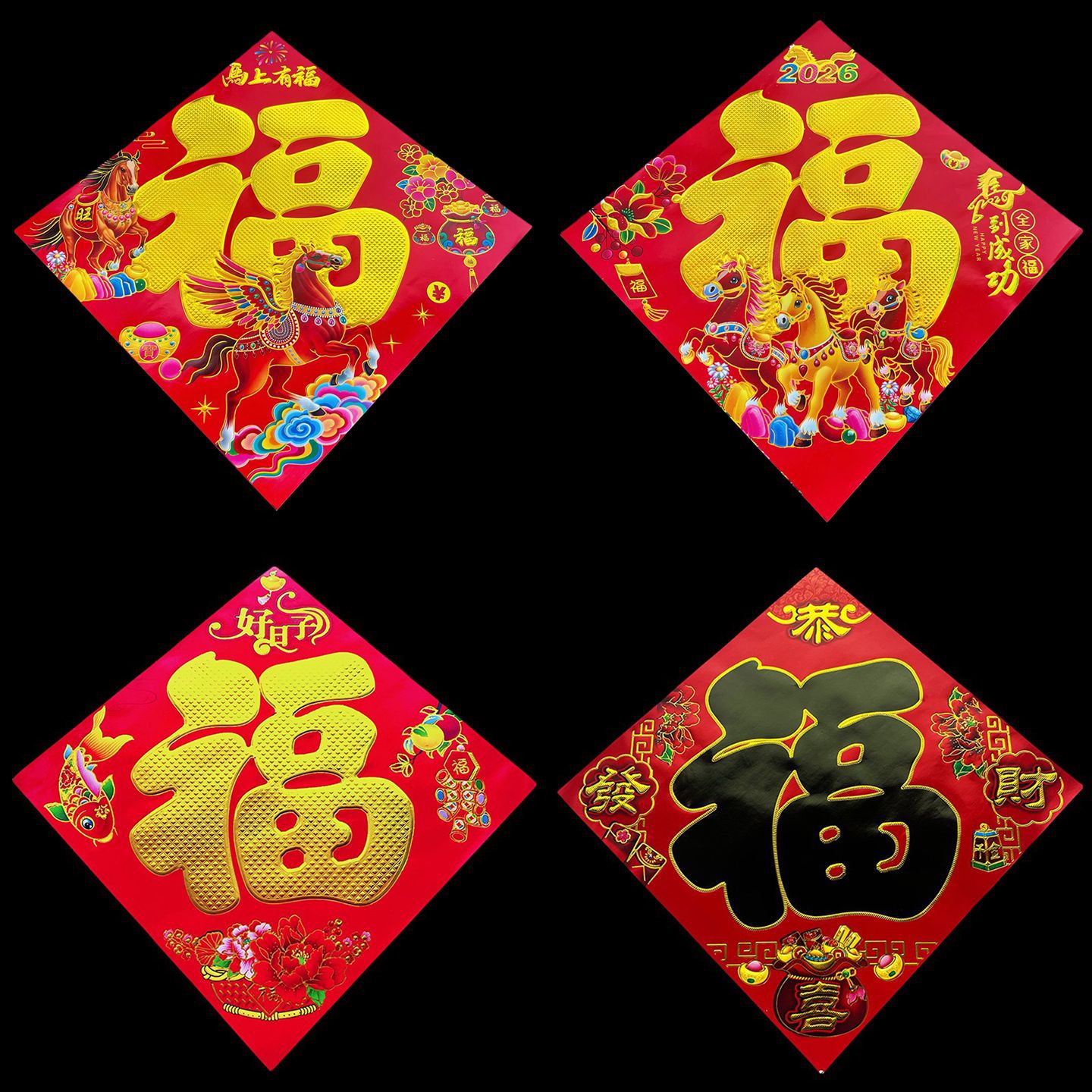 2026年馬年 ベルベット製福文字ステッカー 金箔押し福文字 ドアステッカー 春節用 粘着式 ドア飾り 新年卸売 祝福