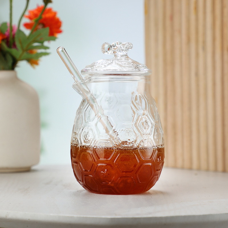 ハニカム六角柄高ホウケイ酸ガラス 透明ガラス蓋付き 撹拌棒 ハニージャー 3点セット