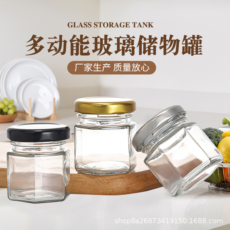 国境を越えた六角形の丸い空のボトル、ハニーハニージャムボトル、小さなボトル、蓋付きガラスボトル、透明な包装、密封ボトル