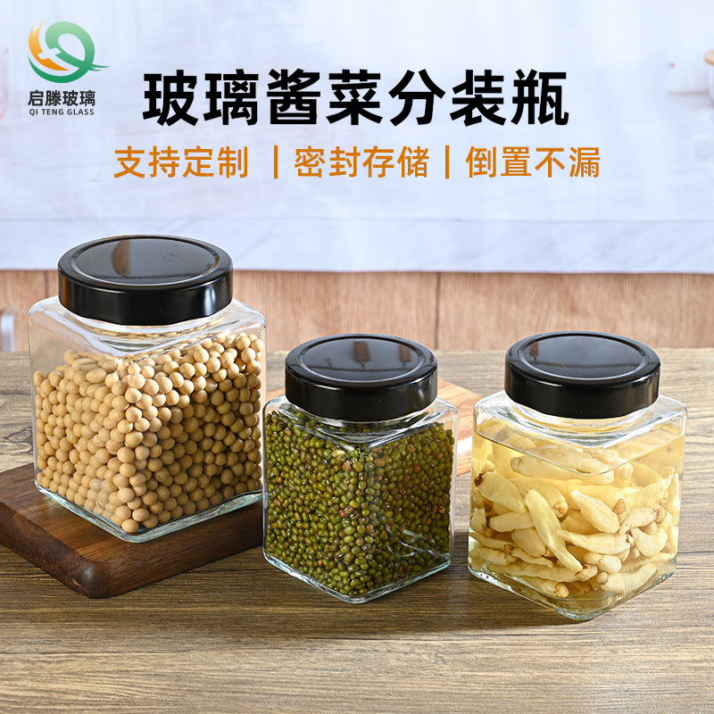四方ガラス瓶貯蔵缶味噌汁瓶台所用品雑穀分注瓶密封蜂蜜ジャム瓶蓋付き