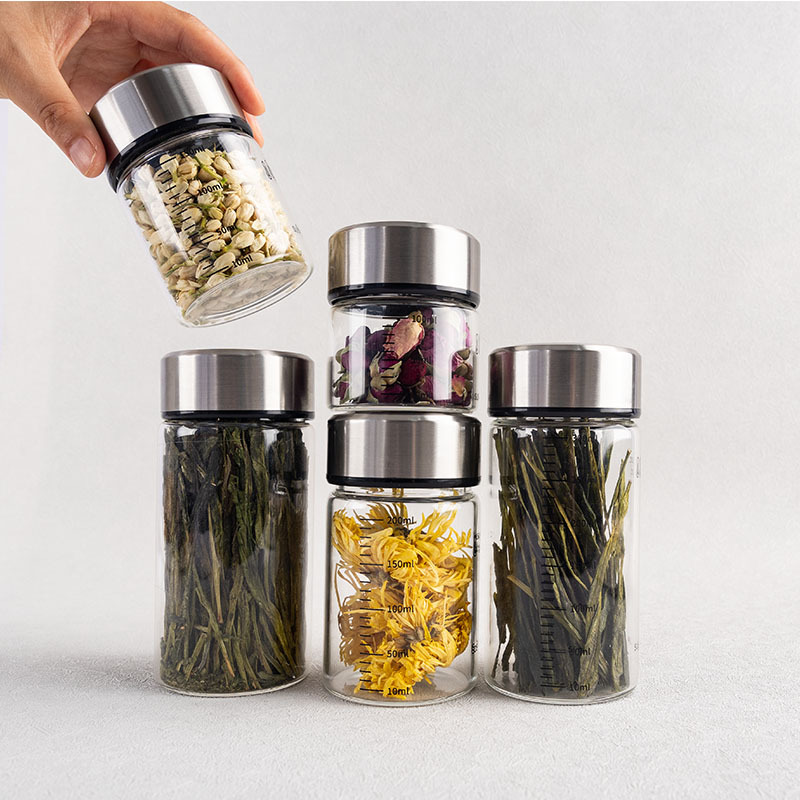 国境を越えた売れ筋のガラス製保存密封瓶、茶穀物包装瓶、透明防湿分類保存瓶