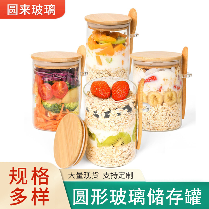 【ガラス缶】竹スプーン高ホウ素シリコン透明竹蓋ヨーグルトオート麦ガラス直筒密封瓶厨房貯蔵タンク