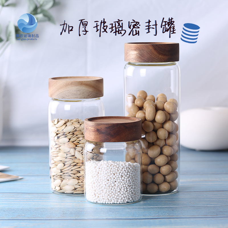 厚みのある丸い透明ガラス製蜂蜜瓶、ネジ口、アカシア材の蓋付き保存瓶、穀物密封瓶