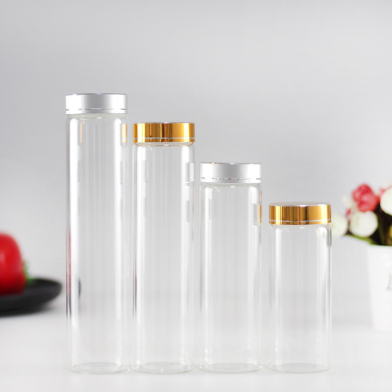 47アルミ蓋付き高ホウケイ酸ガラス瓶、キャンディー瓶、薬剤カプセル瓶、花茶・茶葉分注瓶、サンプル冬虫夏草瓶