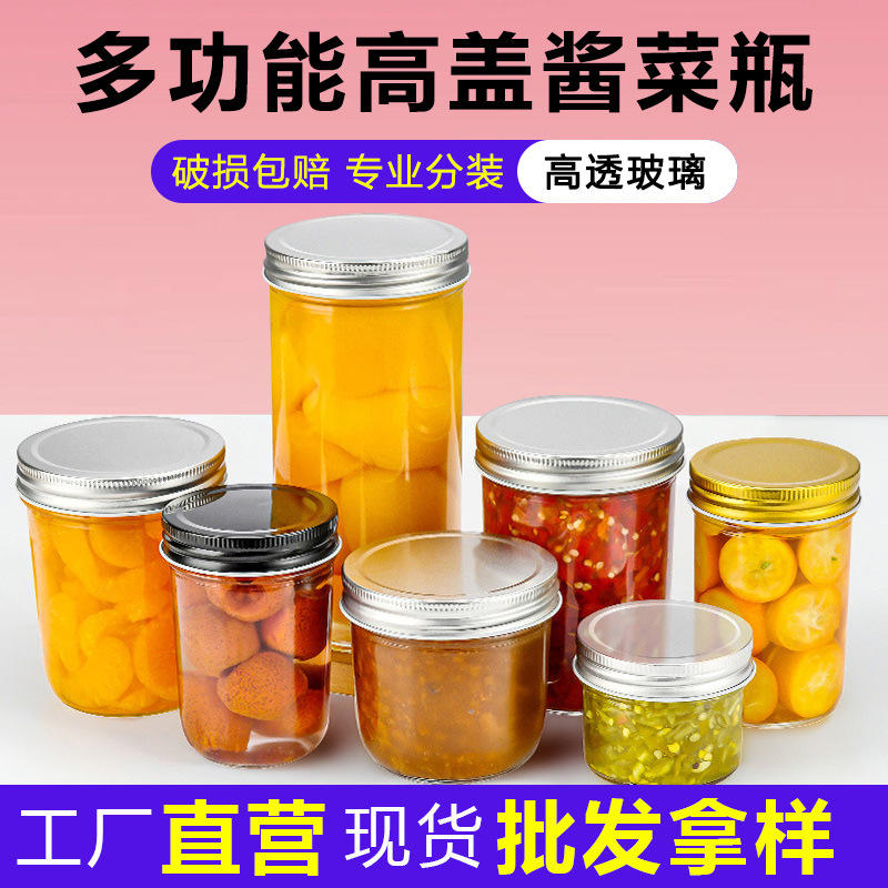 卸売透明ガラスメイソンジャー大口径キャビアボトル蓋付き密封ジャムガラスボトルセット栄養補助食品ボトル