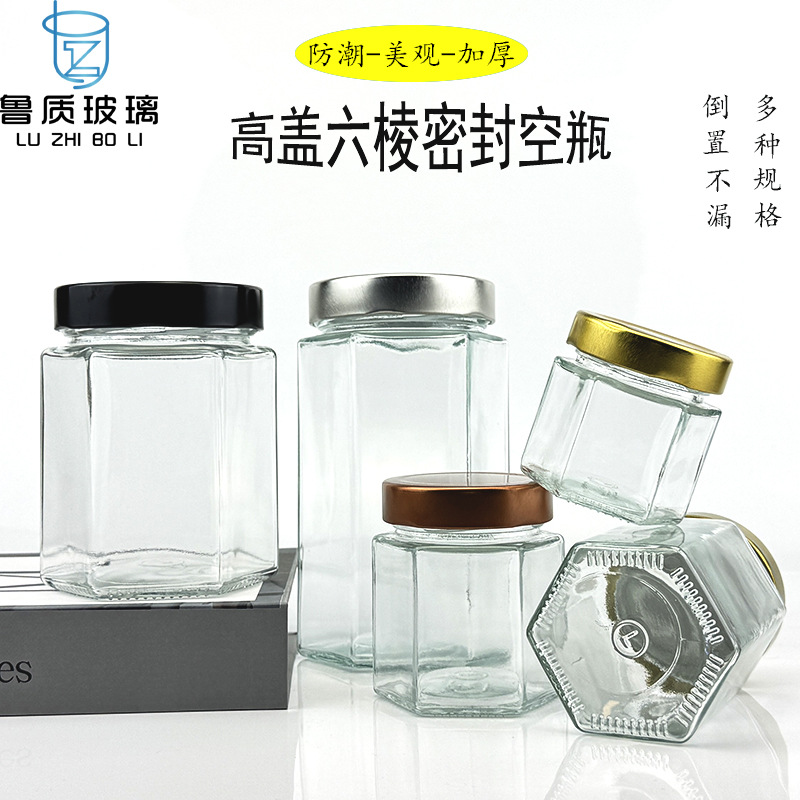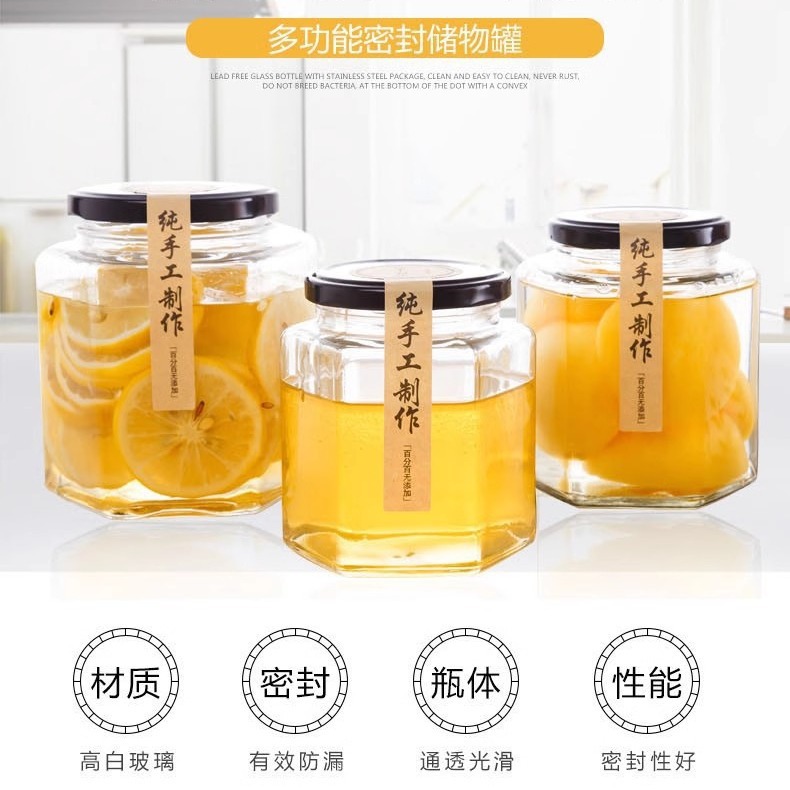 スポット卸売ハイカバー透明ガラスボトル六角ピクルスボトルキッチン穀物保存瓶六角ジャム密封ボトル