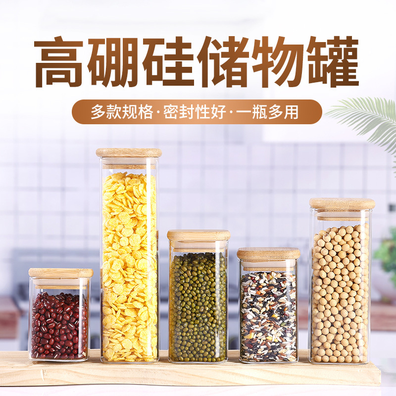 竹と木の蓋付き正方形と四角い保存瓶、高ホウケイ酸透明保存瓶、キッチン穀物密封瓶、食品包装瓶、空瓶