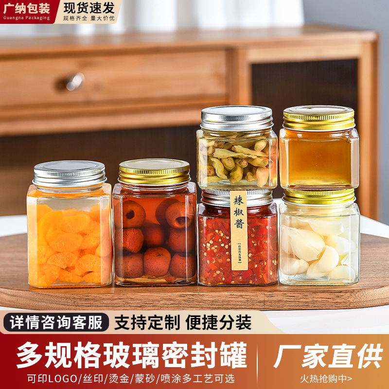 卸売り角形大口ガラス味噌汁瓶密封五穀雑穀防湿貯蔵タンク蜂蜜カプサイソース分注瓶