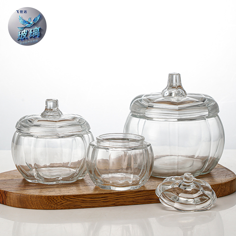 国境を越えた卸売透明なガラスのカボチャの形の保存瓶クリエイティブなアロマセラピーカップキャンドルコンテナとカバー付きキャンドルホルダー