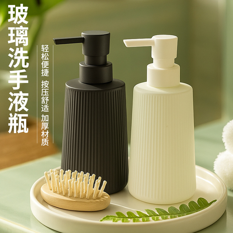 新製品 Amazon越境販売 白黒ガラス製ソープディスペンサー 平肩縦縞ハンドソープボトル ローションボトル プッシュボトル 350ml