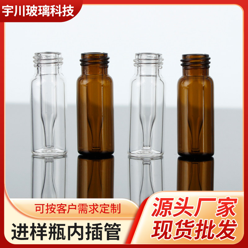 メーカーの注入瓶の中に透明なガラスのサンプル瓶を挿管します。