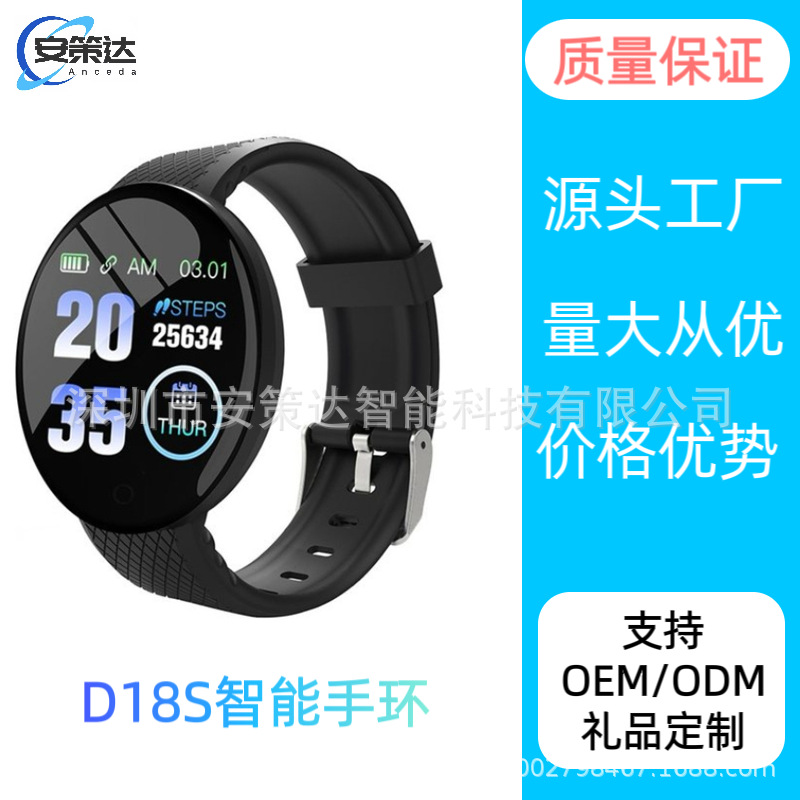 D18スマート手環カラー円スクリーン心拍数血圧睡眠モニタリング歩数運動腕時計1.44インチ運動手