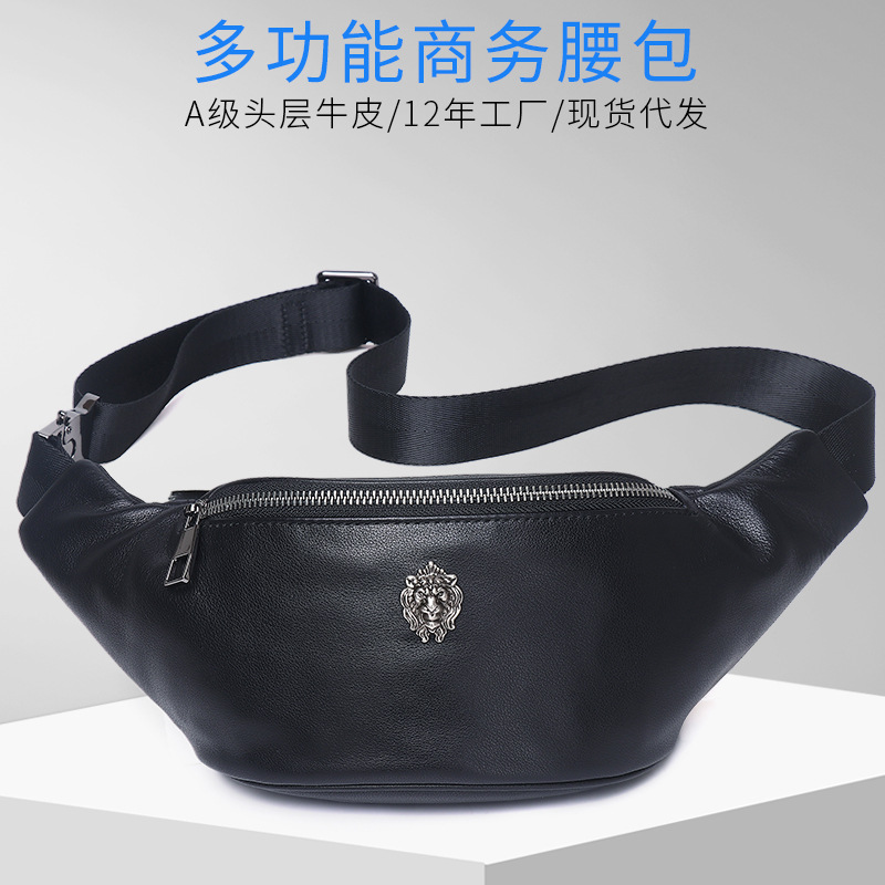 ライオンのレイトンの頭の層の牛革のウエストバッグの男性は携帯電話の多機能の運動の本革の斜めのショルダーの胸の包みの高級感の越境を置きます。
