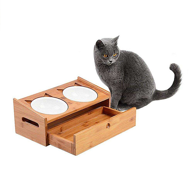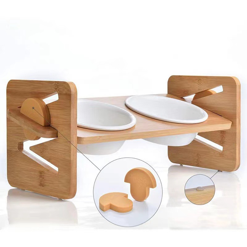 竹質斜面保護首陶磁器猫碗竹棚給餌器ペット碗引き出し式高足猫碗双碗