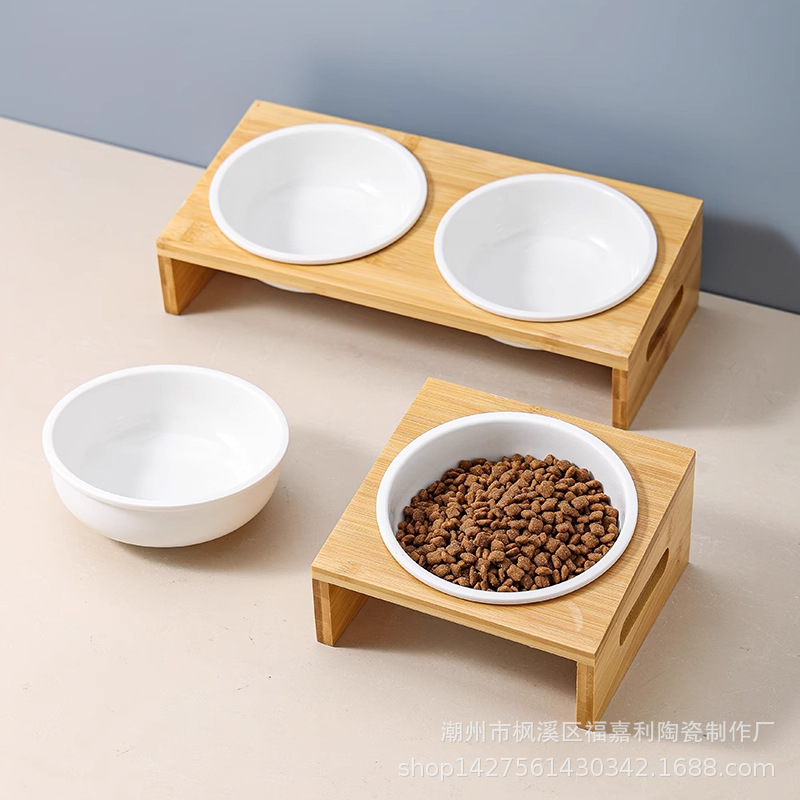 猫碗陶磁器木造双碗猫糧盆防打斜口保護頚椎飲水碗ペット用品