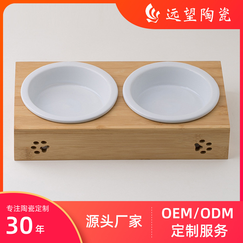 セラミック工場oem/odm幼猫犬セラミック竹木棚ペット食事ボウル首保護転倒防止セット