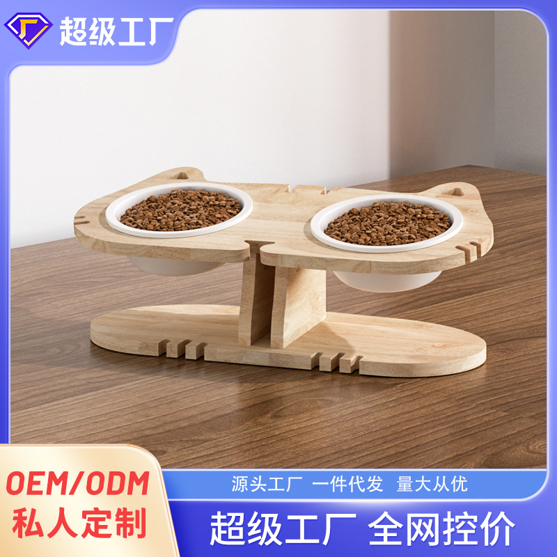 カスタムセラミック猫ボウル純実木オーク材猫用品傾斜首保護猫鉢ペット用品