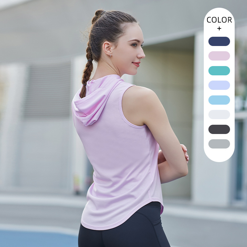 夏のノースリーブベスト女性屋外速乾ランニングトレーニング薄い通気性ヨガフード付きフィットネスウェア上着