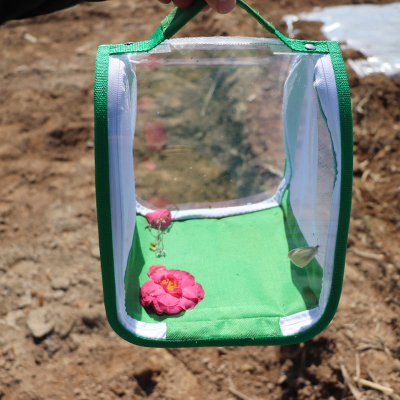 春の遊びの子供たちは手に持っている昆虫の蝶々籠を折って子供を育成して動物の脱変過程を観察します。