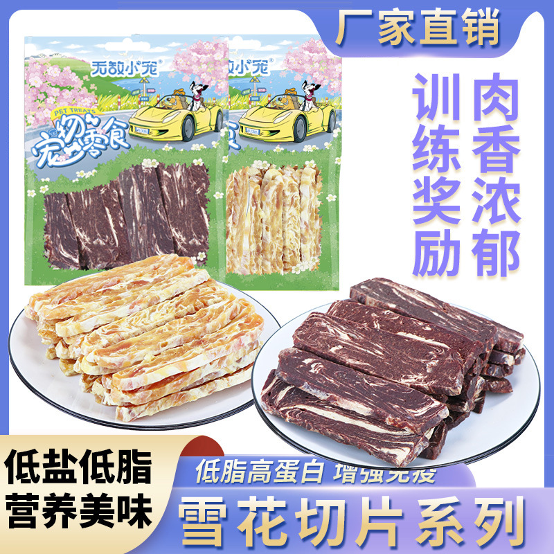 ペットの間食卸売り雪花鶏スライス雪牛スライス純肉犬間食訓練犬奨励400g精装