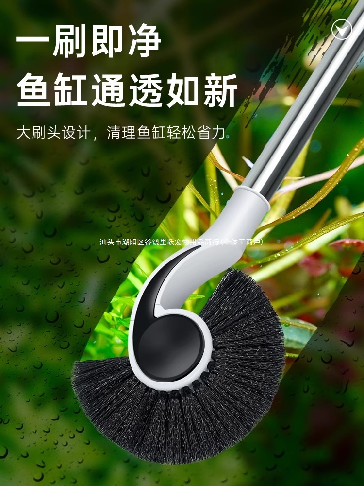 金魚鉢のブラシの長い柄に死角がない清潔な道具五合一は藻刀を剃って神器をきれいにして金魚鉢を磨いてスポンジブラシを拭きます。