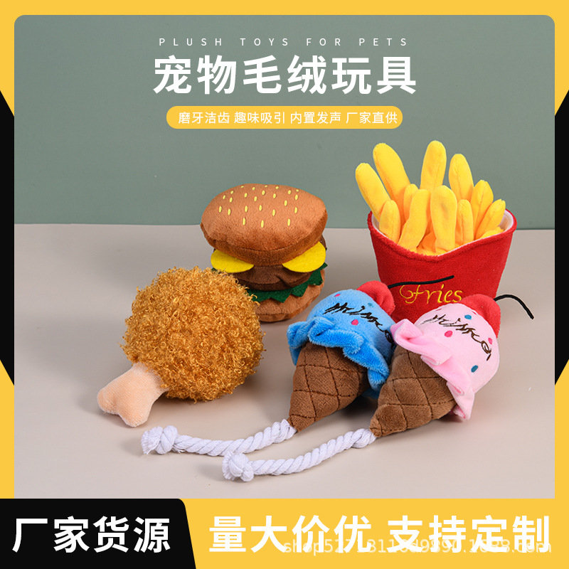 新しいぬいぐるみの音のおもちゃ犬の食べ物のフライドポテトのハンバーガーのペットの猫は歯ぎしりをかじってペット用品を笑わせます。