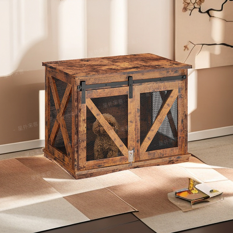 クロスボーダースライディング纳屋ドア犬キャビネットボックス家具式犬ケージエンドテーブル鉄スチール木制プレート式屋内犬小屋メッシュ