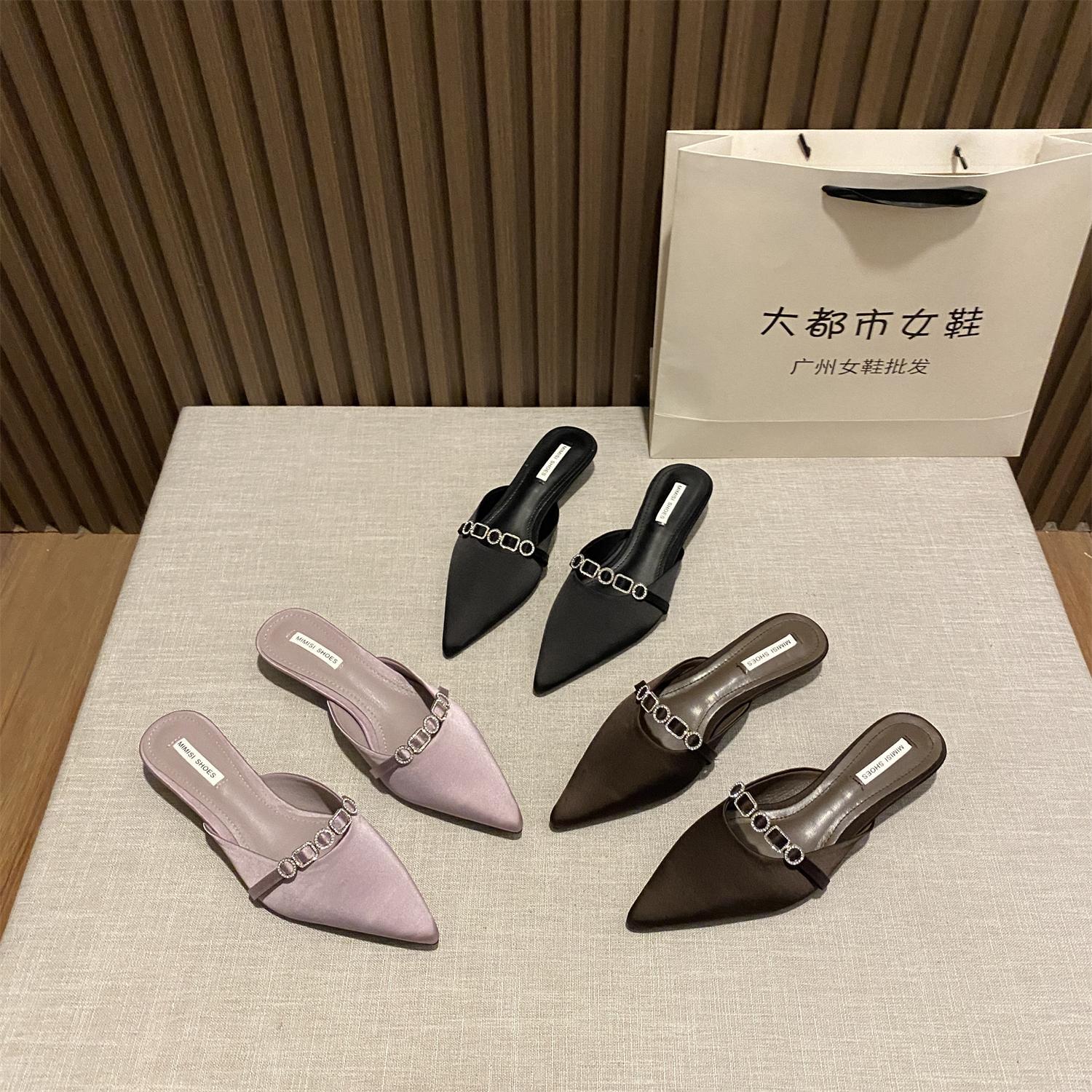絶紫2025春夏低ヒールのサテンの先のドリルの半スリッパの女性は高級感を着ています。