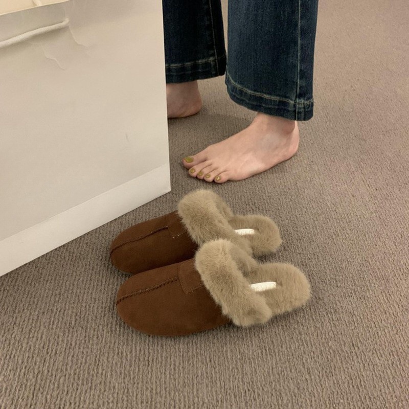 レトロな森系の砂の皮の平の包みの半分のスリッパの女性の外は2024秋冬の新型の綿の靴とベルベットの布の布の布の布の布のベーケンの靴を着ます。