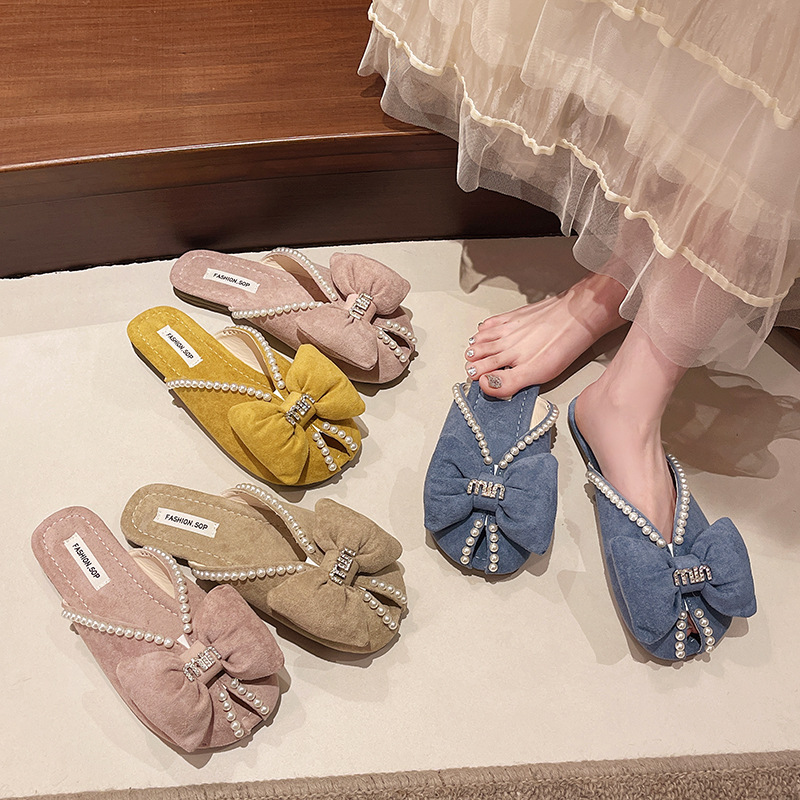 包頭ハーフスリッパ女性の夏のアウターウェア 2025 新韓国スタイルのリボンパールフラットソフトソールフィッシュマウスサンダル