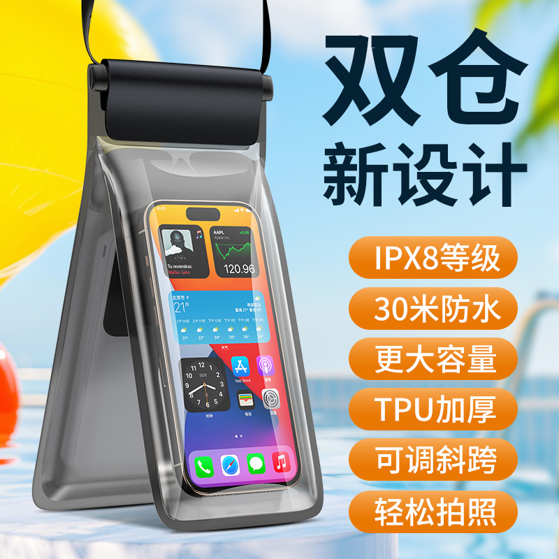 Amazonの人気のダブルコンパートメント携帯電話防水バッグ水泳ラフティングダイビング写真撮影首吊りPVC品質携帯電話ケース