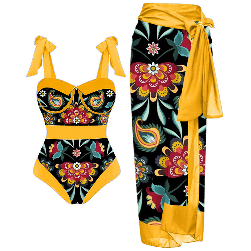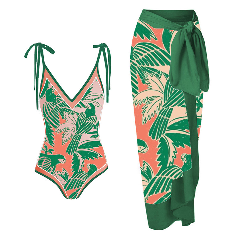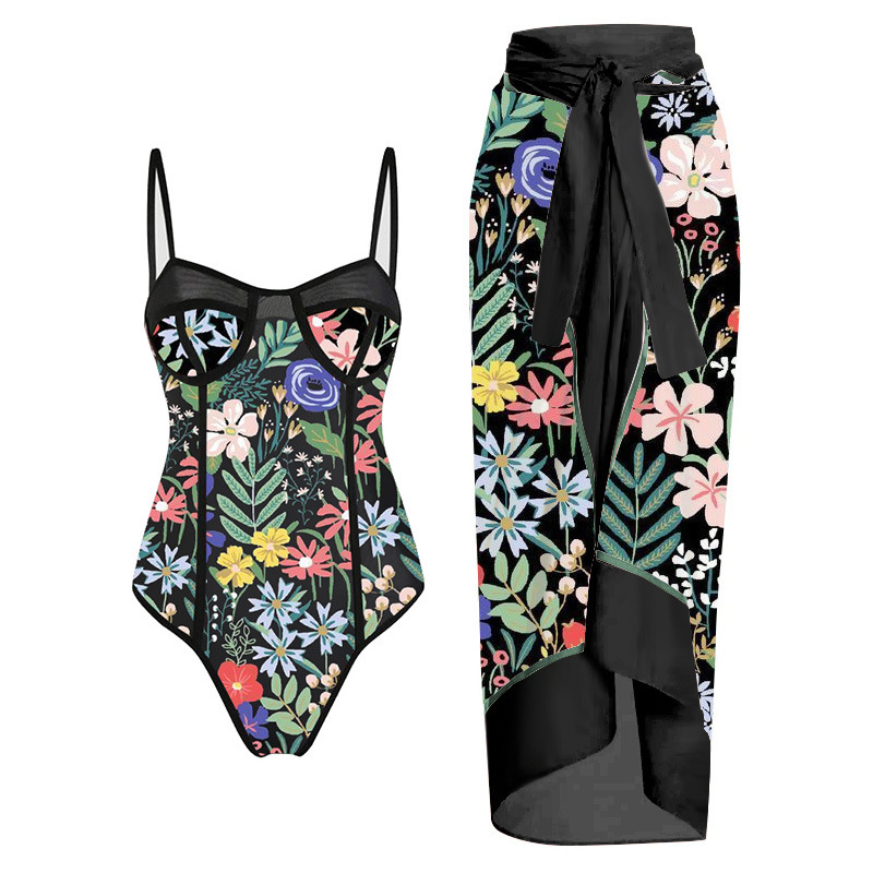 情熱的な花柄ビキニワンピース V ネックヨーロッパとアメリカのアマゾン花柄タイトな水着女性 + スカート