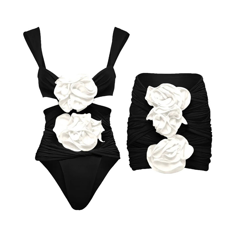 黒と白の立体花柄ワンピース水着セクシーな中空Uネックサスペンダー水着女性ヨーロッパとアメリカのクロスボーダービーチスカート