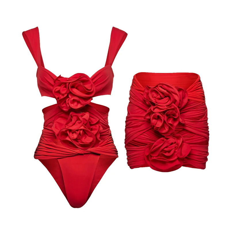 熱い中国の赤い立体花ワンピース水着プリーツ中空水着女性のホットでセクシーなビーチスカート