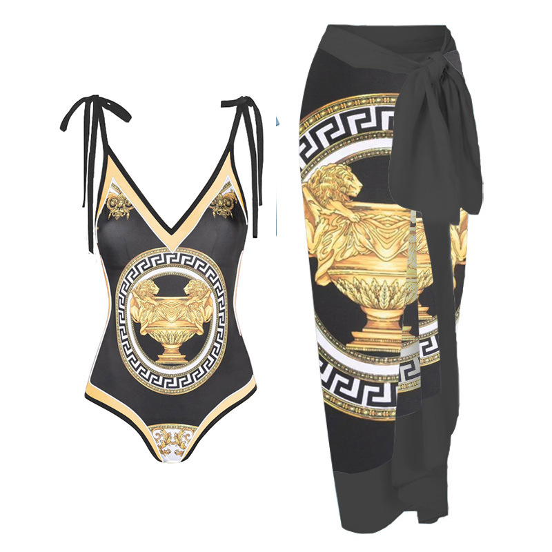 ブラックゴールド高級Vネックレースアップワンピース水着+ラップスカートセット宮殿風ライオン柄水着2点セット