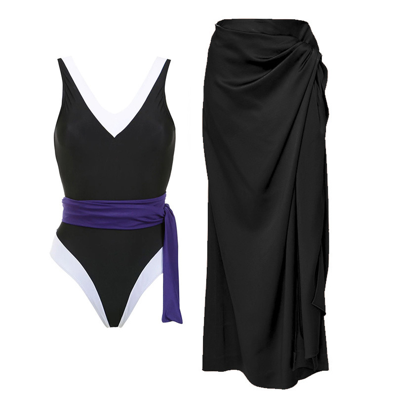 ヨーロッパとアメリカのクロスボーダーモダンでクールなVネックコントラストカラーワンピース水着ビーチバケーションハーフスカートプール水着スカート