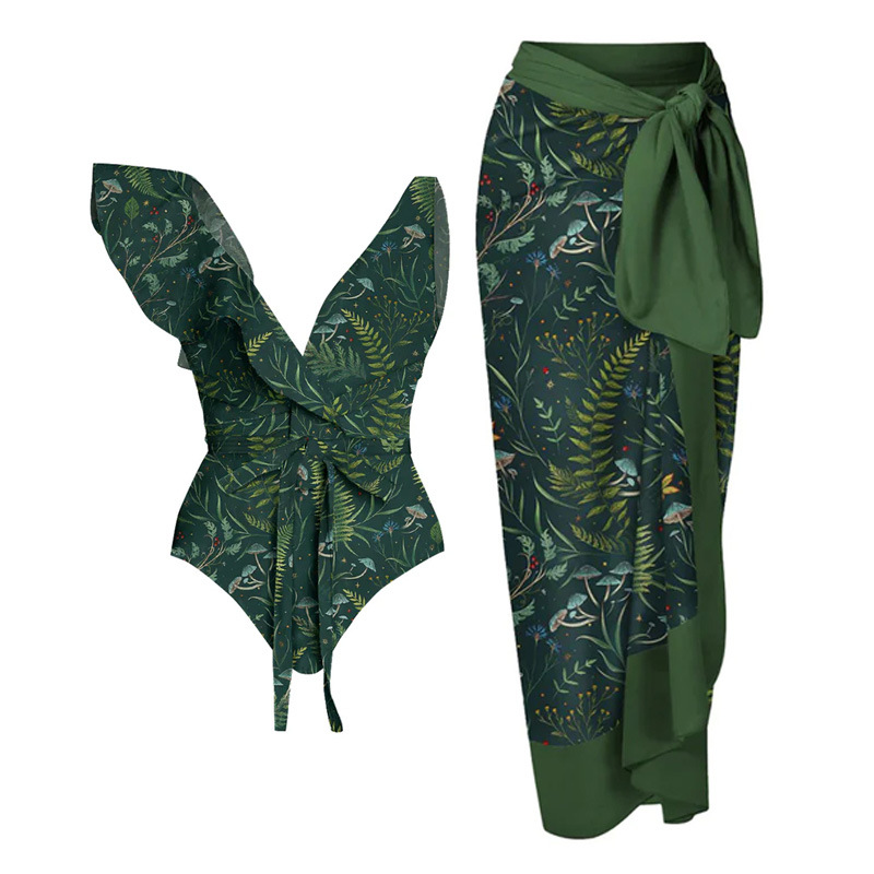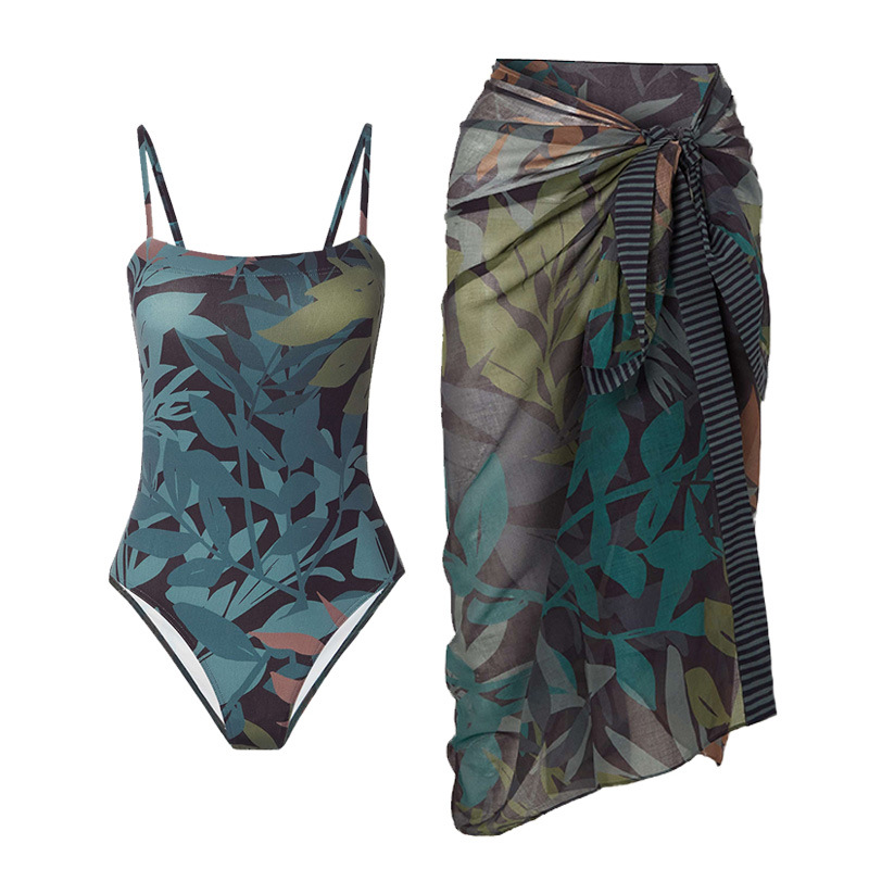 ナチュラルフォレストスタイルプリント水着セット夏のビーチ休暇ハーフスカートワンピース水着ツーピースセットヨーロッパとアメリカ