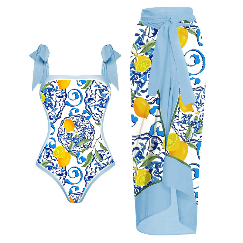 フルーツレモンプリント水着セット鮮やかな青と黄色のストラップ付きバックレスワンピース水着女性用スカート付き