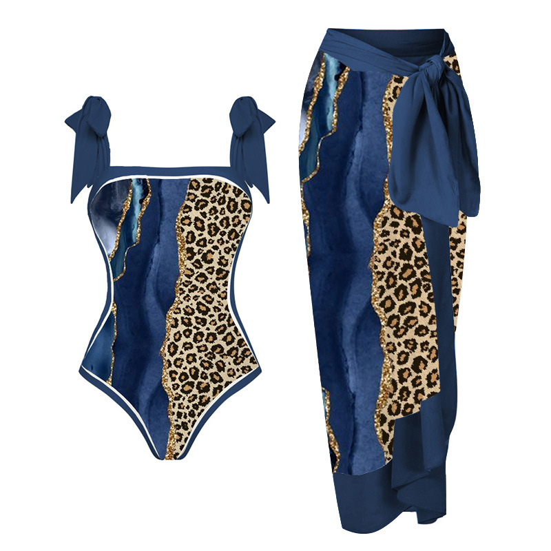 ワイルドブルースリボンショルダーストラップワンピース水着ヒョウ柄カラーブロックストラップワンショルダー水着女性ヨーロッパとアメリカのクロスボーダー