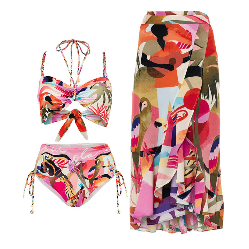 ヨーロッパとアメリカのクロスボーダー夏の鮮やかなトロピカルプリントストラップビキニ+ラップスカートスーツインターネットセレブ休暇水着