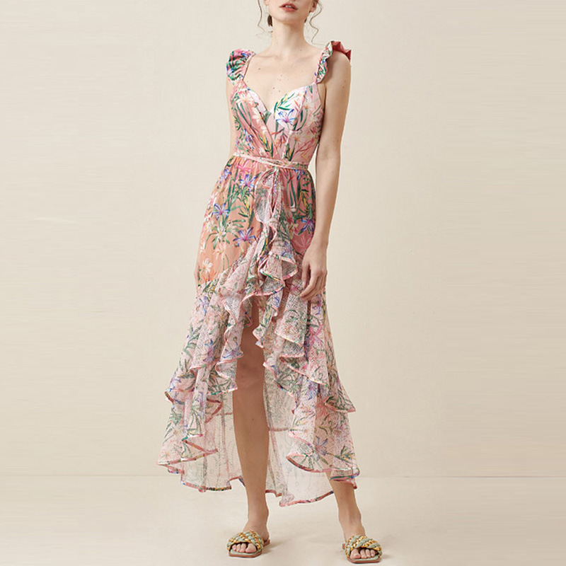 Pure Yiyun Vネックフリルレースアップロングカバーアップホリデー必須ビーチビキニカバーアップリラックス感ヨーロッパとアメリカ