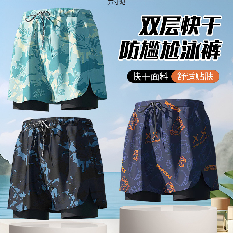 男性用二層水泳パンツ、恥ずかしさ防止、大人用3点セット、速乾性、通気性、伸縮性、ゆったりとした水泳スポーツビーチパンツのサプライチェーン