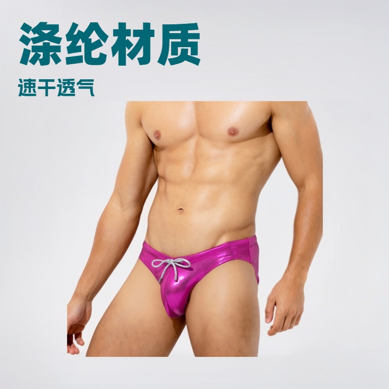 貿易メンズ模造革シルバーパウダーブライトレザートライアングル水泳パンツ U 凸立体パフォーマンスキャットウォーク速乾性ビーチブリーフ男性用
