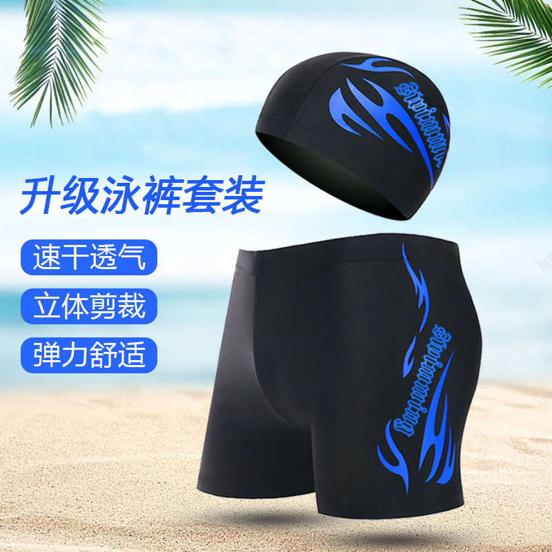 平角男性水泳パンツ水泳帽セット炎プリント大サイズ速乾水泳温泉パンツ卸売りクロスボーダー直販