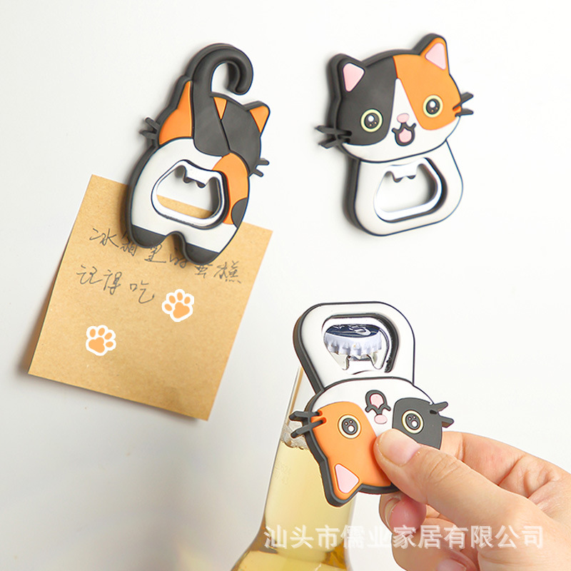 日本式のかわいい三花の猫の漫画のアイデアの猫の冷蔵庫は瓶を開ける器を貼ります。